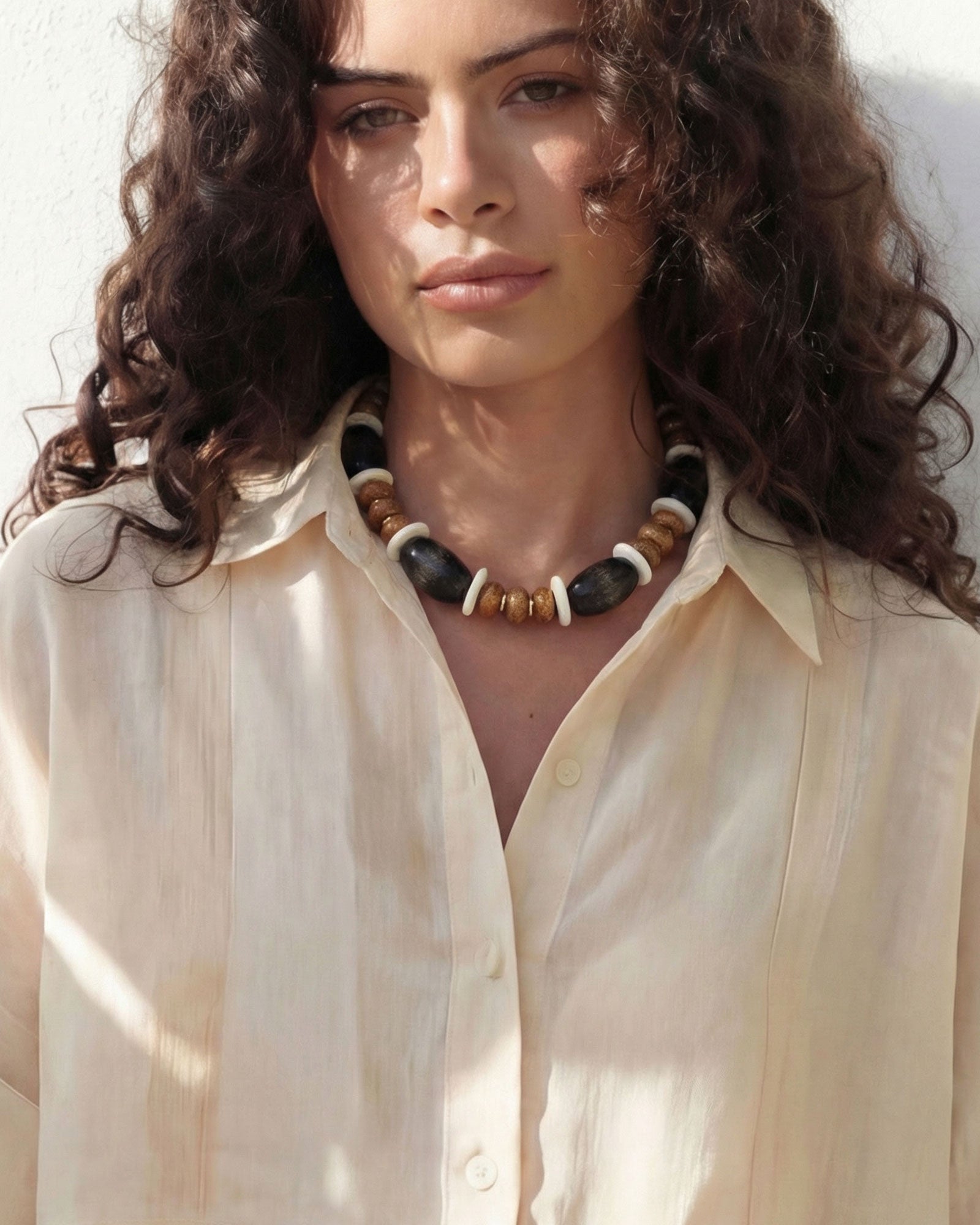 Our Jave necklace is handmade and features a mix of brown wood beads, warm ceramic caramel toned beads, and ceramic ivory spacers, finished with 18k gold discs.