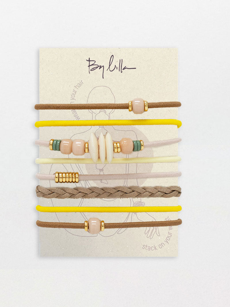 Introducing the Seashore Pack Bracelet/Hair Ties. This pack includes neutral and yellow tones with gold accents, along with neutral glass and bone beads, and unique enamel disc ocean-inspired bracelet hair ties—perfect for adding a touch of style to your look. With 8 pieces in each pack, you'll have plenty of options for accessorizing and effortlessly upgrading your outfit.