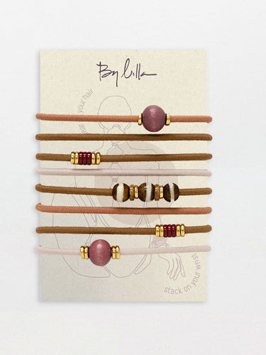 Introducing the Sun Tan Bracelet/Hair Ties. This pack includes neutral and warm tones with gold accents, along with brown bone beads, and unique enamel disc ocean-inspired bracelet hair ties—perfect for adding a touch of style to your look. With 8 pieces in each pack, you'll have plenty of options for accessorizing and effortlessly upgrading your outfit.