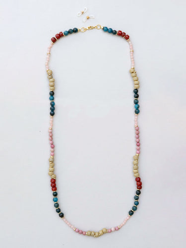 THE TRIBECA beaded chain is designed to keep up with your everyday. Hand-strung, with recycled glass, hand painted ceramic and wood beads, it's lightweight and versatile. It transitions effortlessly from playful necklace to chic sunglass chain.