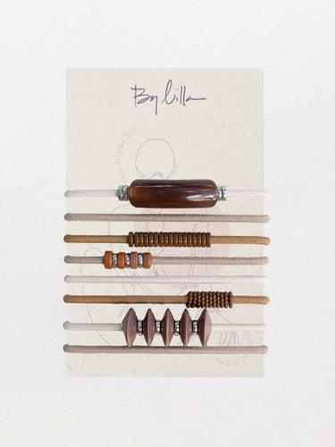 Inspired by desert tones and shifting sand dunes, this bracelet–hair tie set features a mix of sculptural caramel beads, matte mauve discs, woven textures, and polished silver accents on soft neutral elastics.