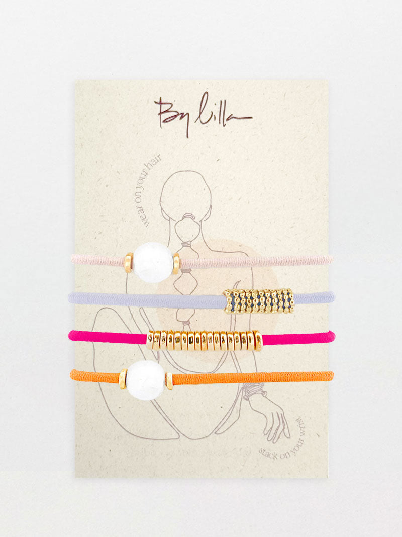 This new category was designed to include a mix of the embellishments from our best selling pack of two that you all love so much. Each bracelet doubles as a sophisticated hair tie, offering versatility for your everyday looks.