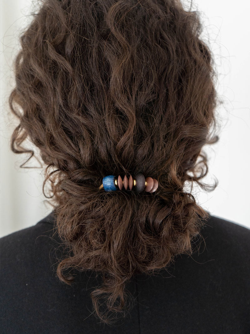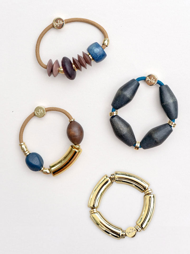Hand-strung with warm wooden beads, sculptural discs, and a denim-blue accent bead, each piece is finished with gold details and By Lilla’s signature clasp. Designed to shift seamlessly from statement bracelet to functional hair tie, it’s the perfect mix of form, function, and city girl ease.
