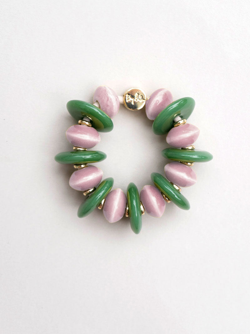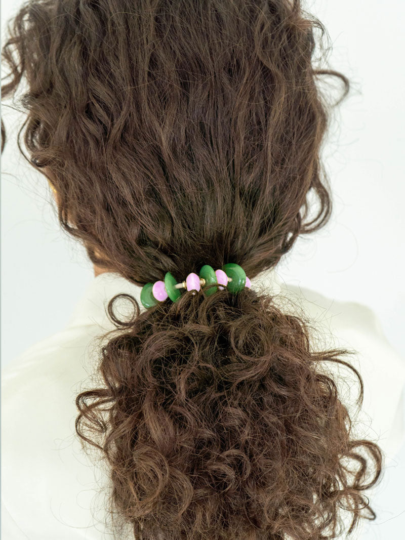 Hand-strung with glossy green discs and sunlit yellow beads, this piece brings a fresh, color-forward twist to your everyday stack. Finished with gold accents and our signature clasp, it moves seamlessly from standout bracelet to functional hair tie—perfect for the woman who loves a pop of personality without sacrificing chic.