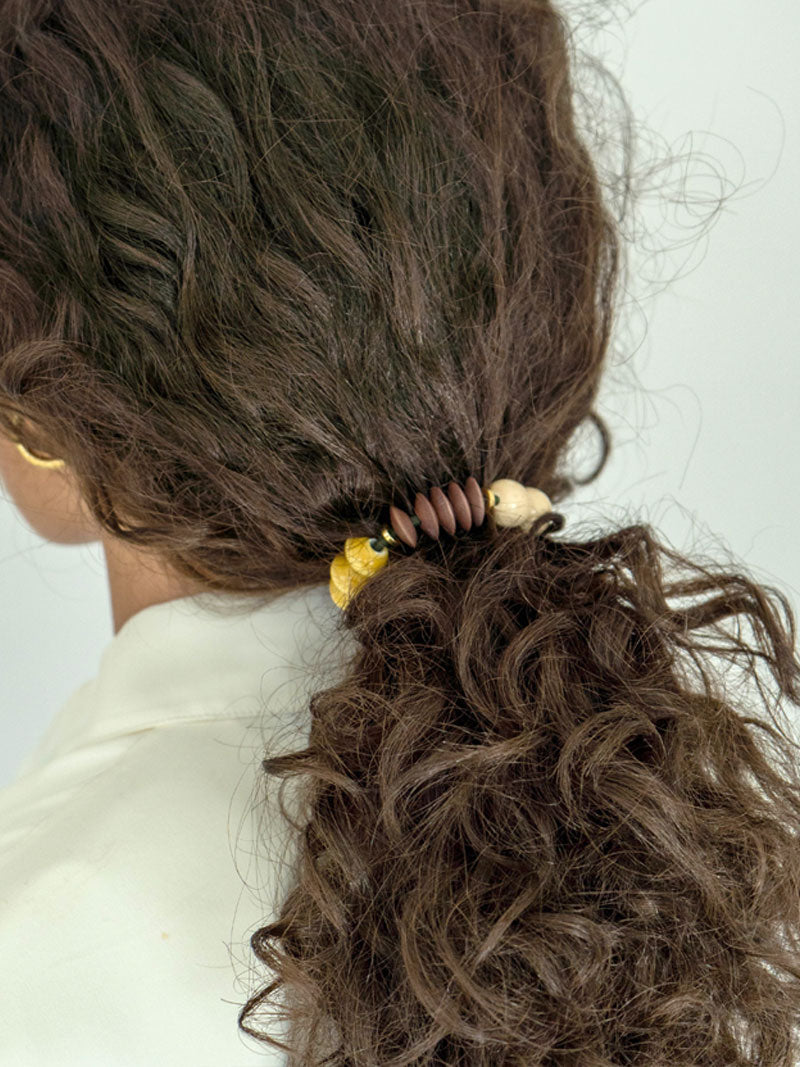 Hand-strung with creamy neutrals, warm yellows, and sculptural mauve discs, this piece blends sun-washed tones with modern texture. Finished with sleek gold accents and our signature clasp, it shifts seamlessly from standout bracelet to functional hair tie—made for the woman who moves through her day with relaxed, elevated ease.
