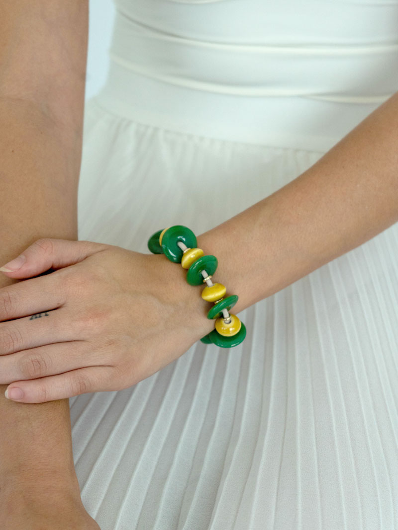 Hand-strung with glossy green discs and sunlit yellow beads, this piece brings a fresh, color-forward twist to your everyday stack. Finished with gold accents and our signature clasp, it moves seamlessly from standout bracelet to functional hair tie—perfect for the woman who loves a pop of personality without sacrificing chic.
