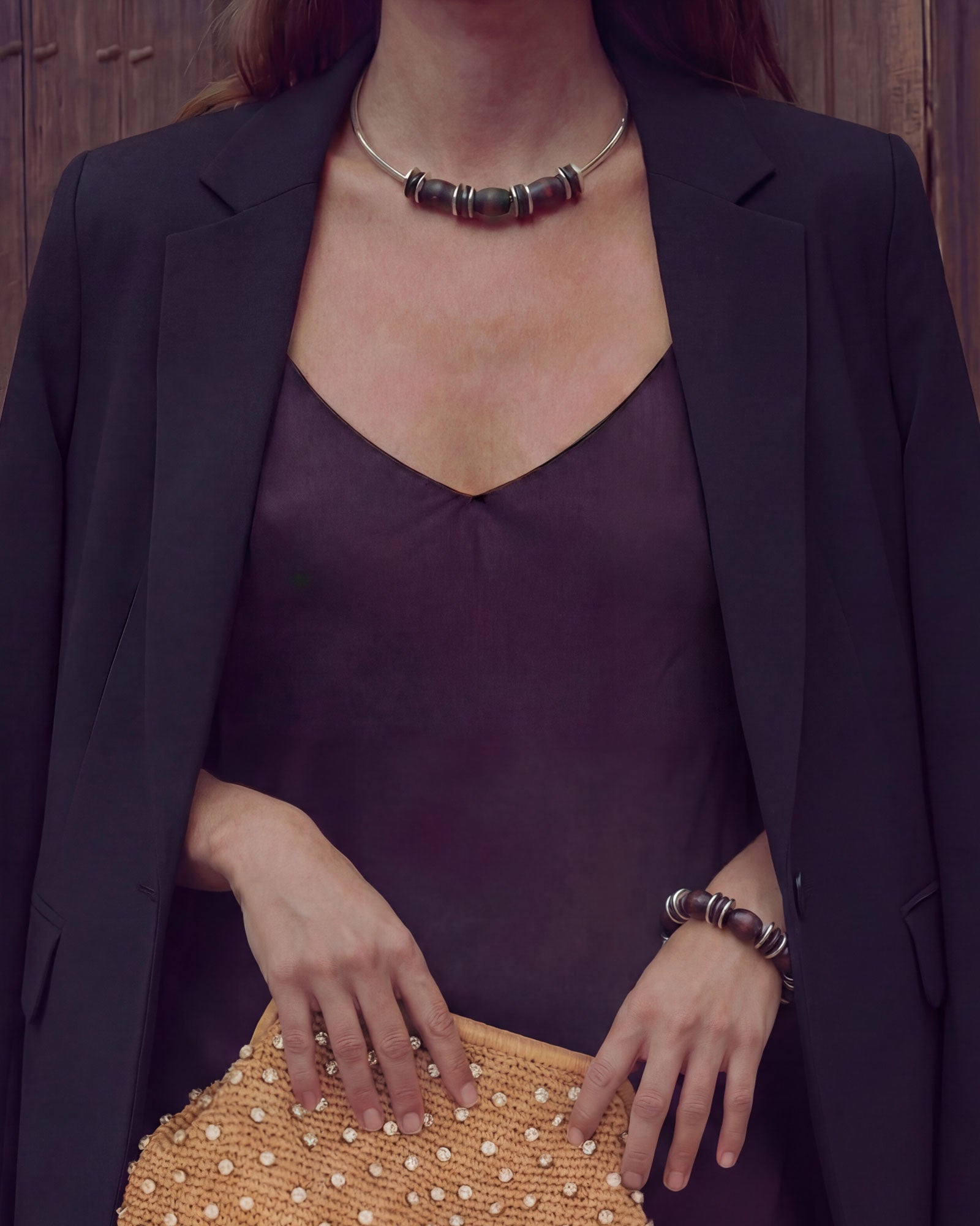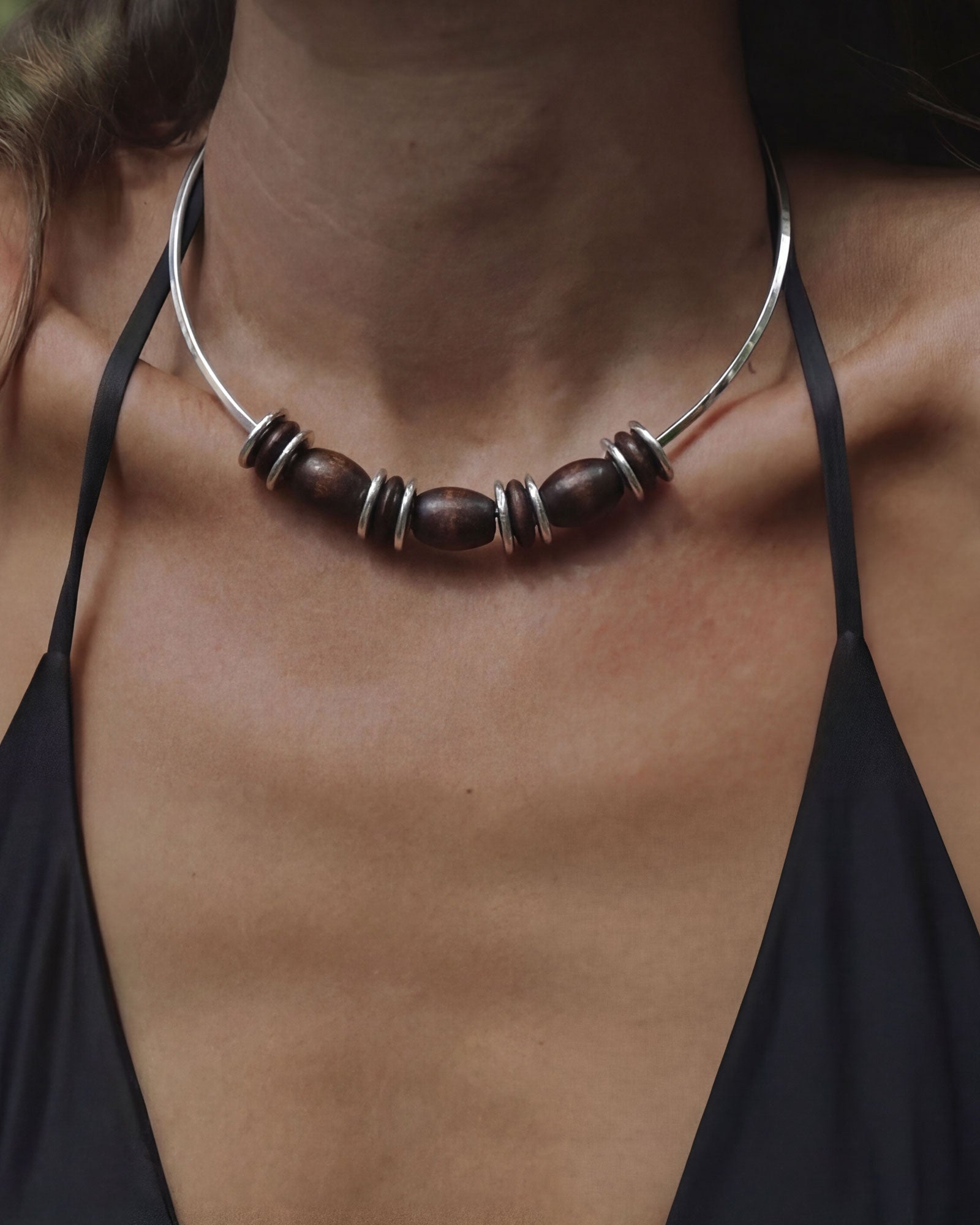 The Nocturna Necklace pairs a sleek silver-tone collar with a bold mix of natural wood beads and polished silver discs. Designed to sit elegantly at the neckline, Nocturna makes a confident statement while remaining effortlessly wearable perfect for elevating everyday looks or adding a modern touch to evening styling.