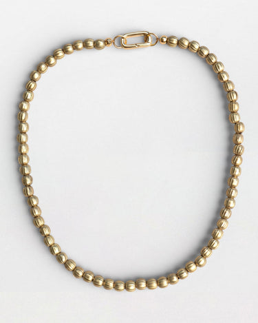 Our Marigold necklace is handmade and features a strand of textured, ribbed gold toned beads. Finished with a sleek 18k gold plated clasp, it’s bold in its simplicity and effortlessly refined.