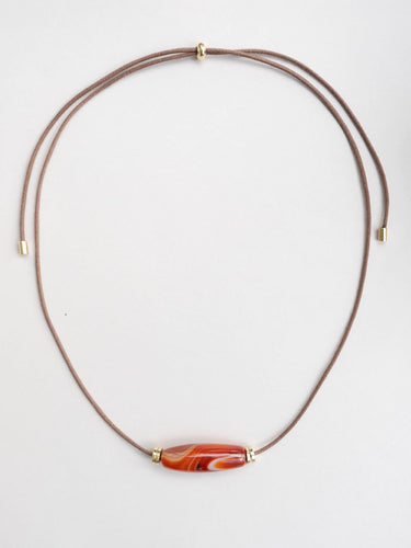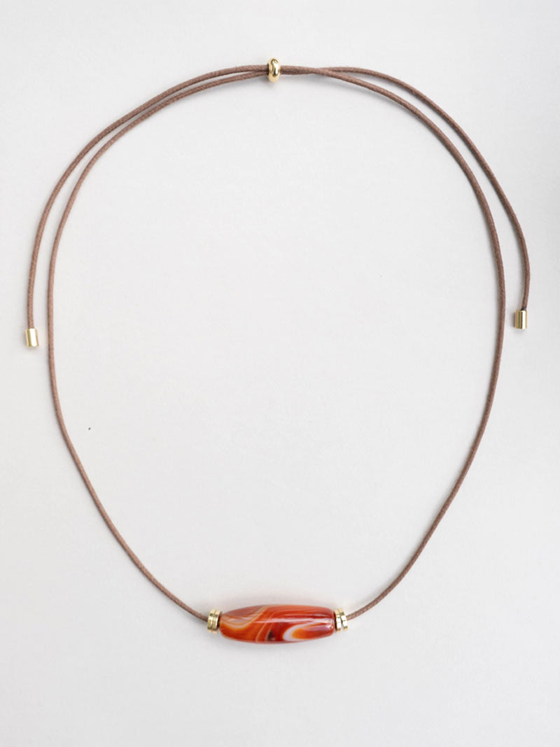 Meet your new everyday signature: the NECTAR necklace, a minimalist piece with a quiet, effortless glow. A smooth, hand-polished agate bead in warm honey-amber tones sits at the center, its natural swirls giving each piece its own organic story. Strung on a soft taupe cord and finished with petite gold-tone accents, it brings just the right mix of earthy and refined.