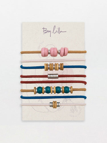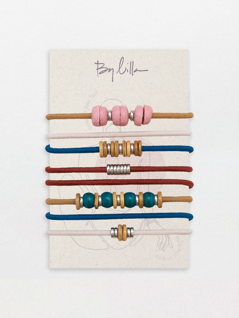 Modern and playful, the CENTRAL PARK set combines pops of blush pink, rich teal, warm wood, and sleek metallic accents on colorful elastics. Handcrafted by our team of artisans in Miami, each piece is designed to move effortlessly from chic wrist stack to functional hair tie—bringing versatility and style to your everyday look.