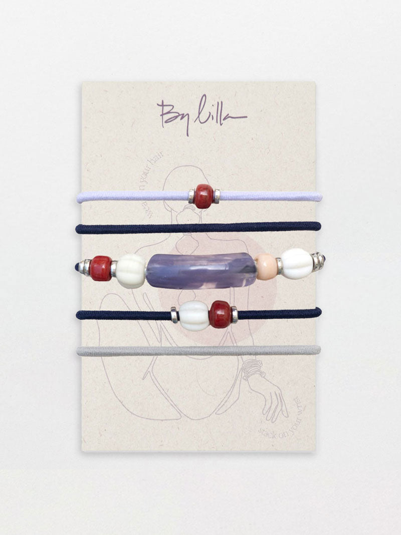 The GALLERY set plays with shape and color for a look that feels like wearable modern art. Featuring a statement lavender bar bead alongside ivory, blush, and deep red accents, each piece is finished with sleek silver spacers for a contemporary edge. Handcrafted by artisans in Miami, these versatile elastics double as chic wristwear or functional hair ties.