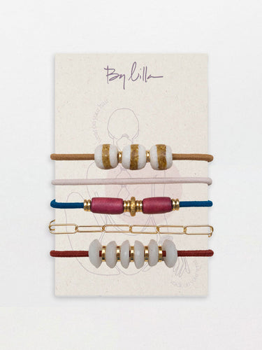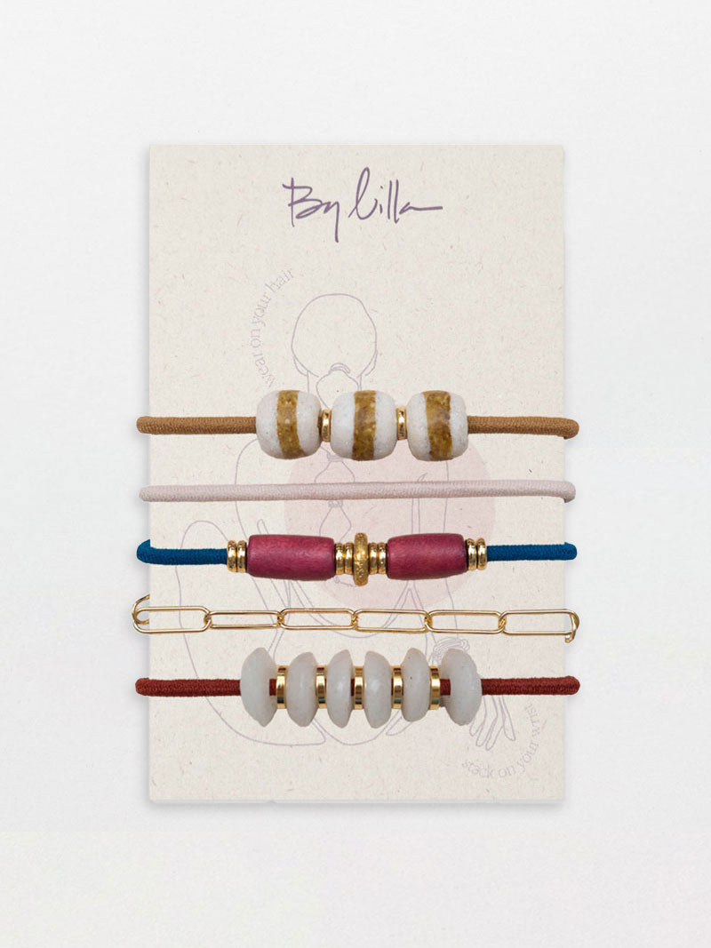 The SPEAKEASY set pairs earthy neutrals with rich pops of color and gleaming gold accents. Featuring a mix of striped ceramic beads, smooth ivory discs, deep berry and magenta tones, plus a sleek gold paperclip chain, each elastic is handcrafted to transition effortlessly from wrist stack to functional hair tie.