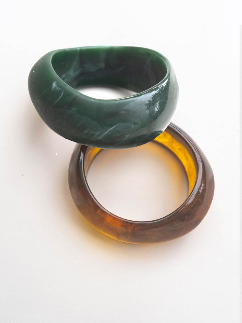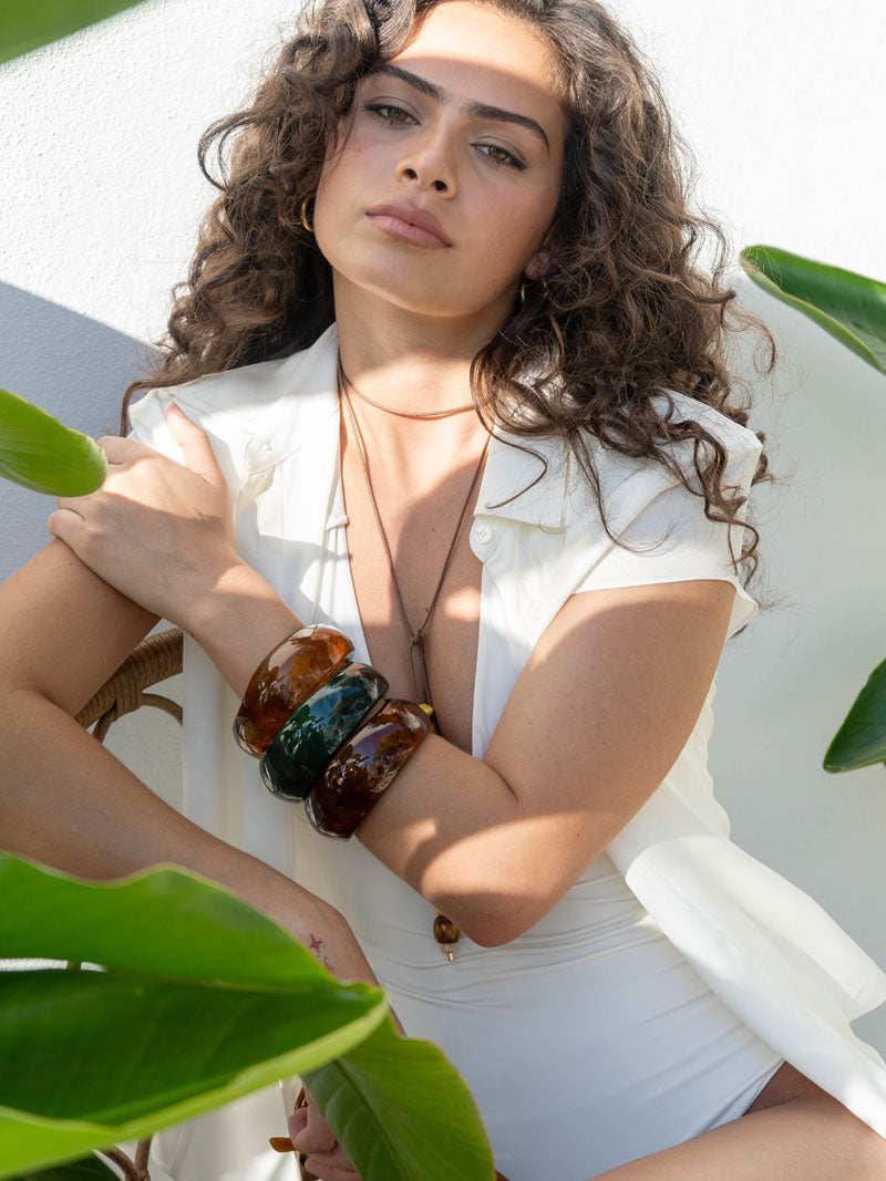 Designed in rich, glossy resin with earthy amber and deep green tones, these chunky statement pieces bring instant downtown edge to any look. Lightweight yet impactful, they’re made to stack, mix, and style from morning coffee runs to late-night plans.