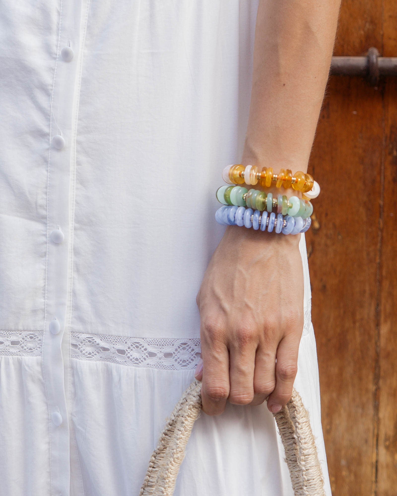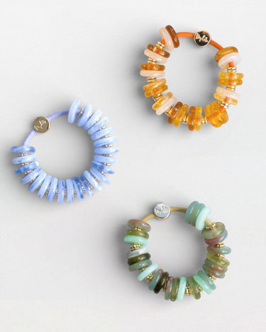 BOUQUET Capsules are a set of three hand-strung with acrylic disc beads, and with delicate silver spacers for a subtle shimmer.