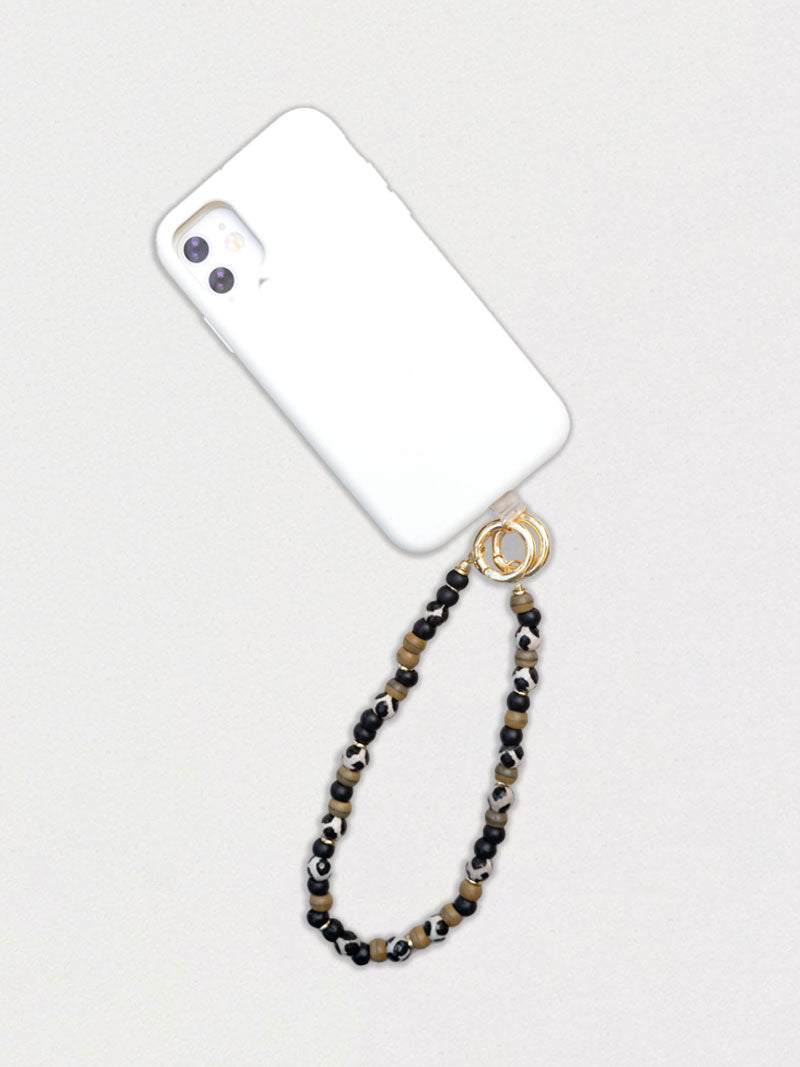 The COBBLE STONE charm is cool and classy. Hand-strung with a mix of black, tan, and spotted beads accented by gold details, it adds a bold yet balanced touch to your everyday essentials. Clip it to your favorite bag, use it as a phone strap, or style it your own way.