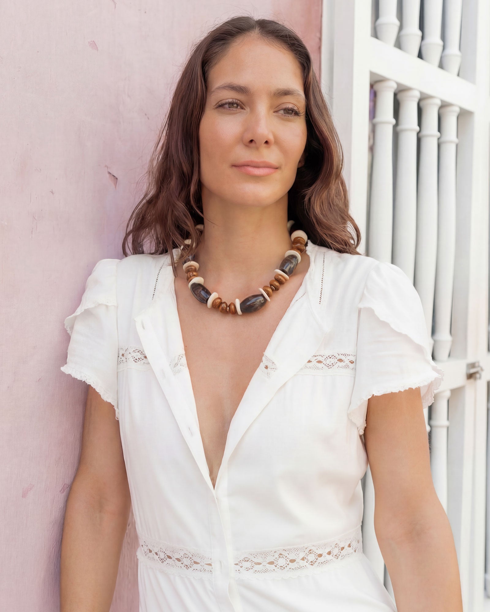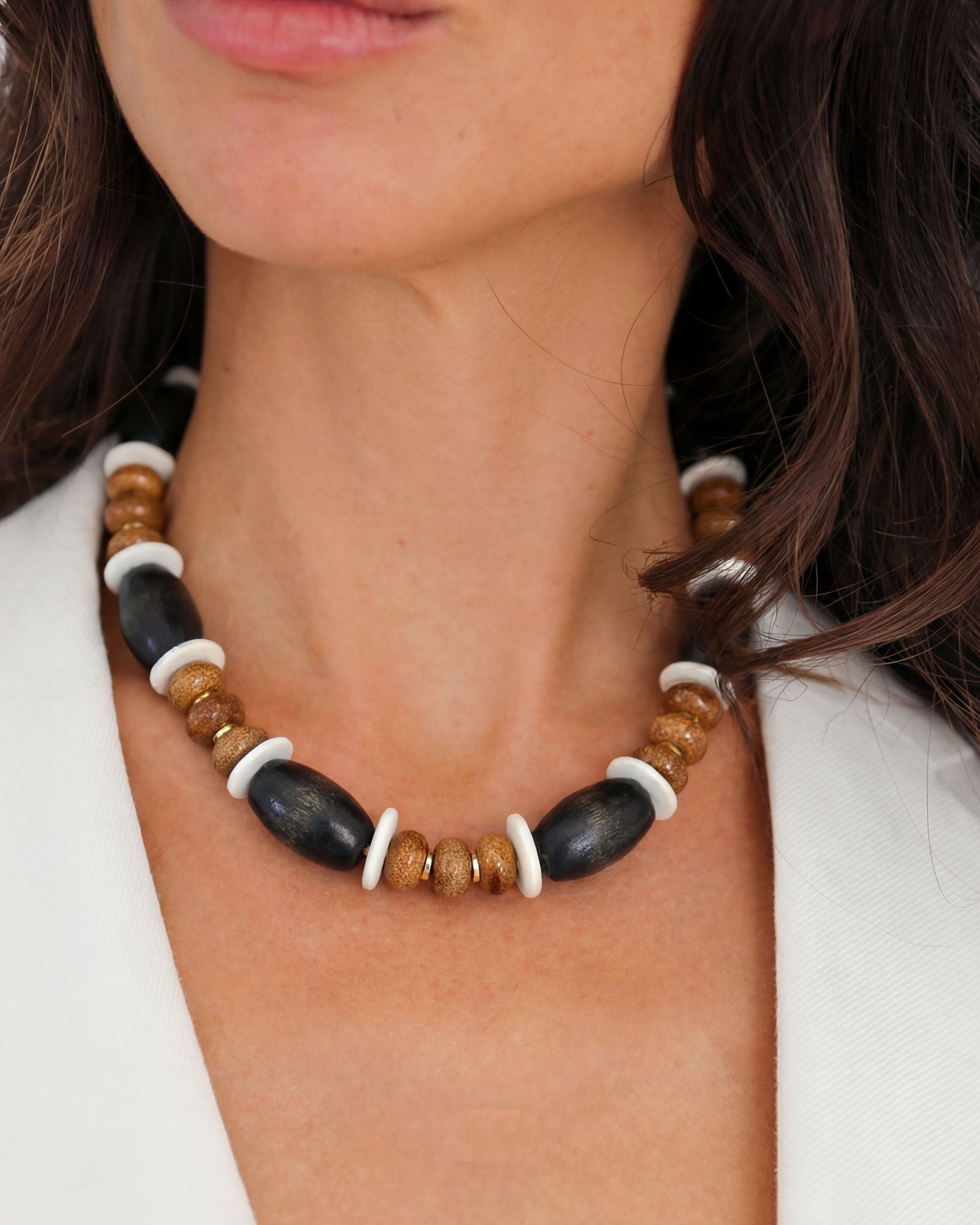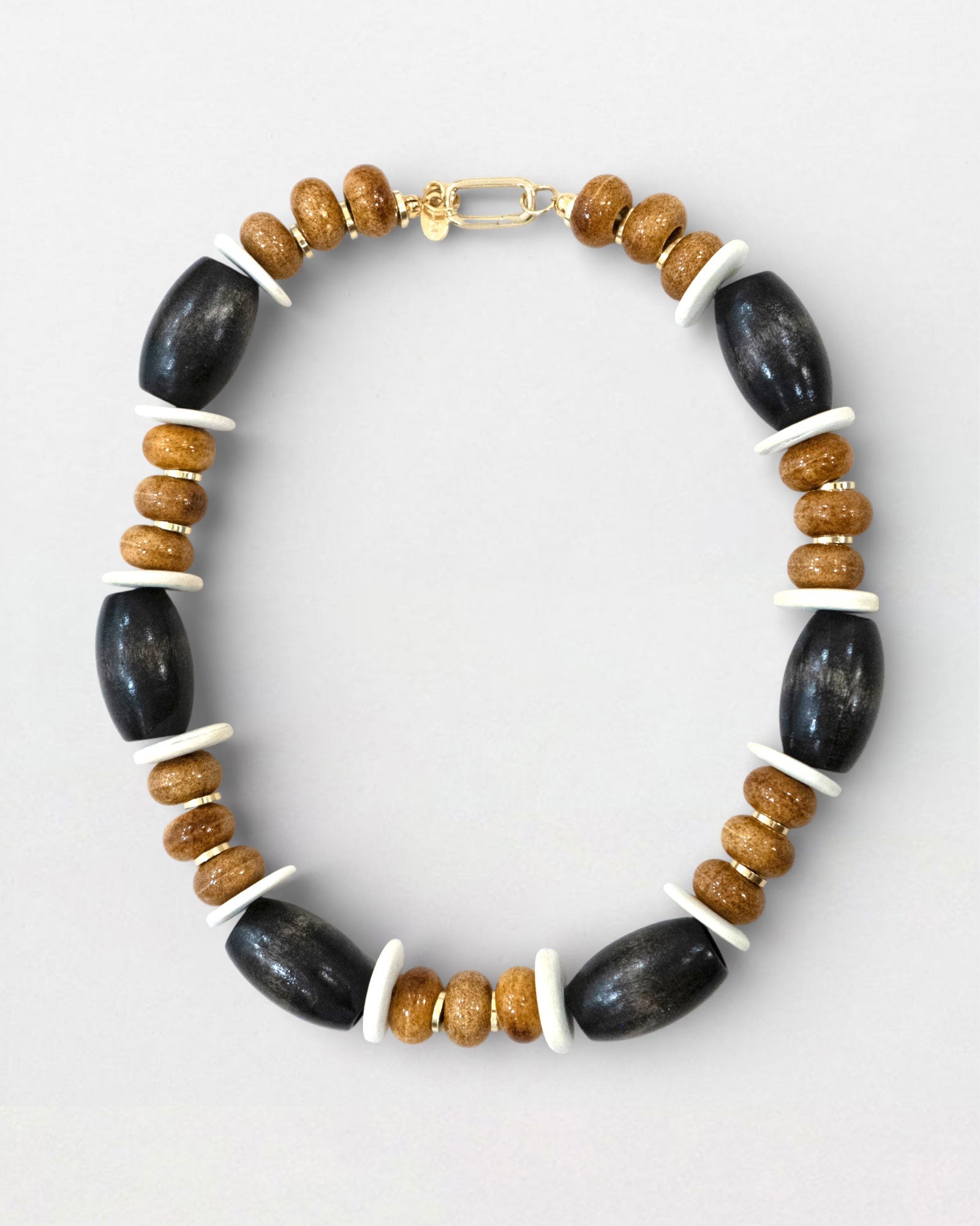 Our Jave necklace is handmade and features a mix of brown wood beads, warm ceramic caramel toned beads, and ceramic ivory spacers, finished with 18k gold discs.