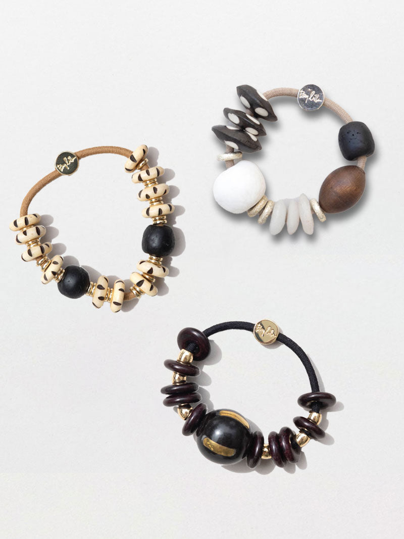 The SUBWAY capsule is earthy, modern, and effortlessly cool. Hand-strung with a bold mix of black, white, and natural wood beads accented with textured neutrals, each piece is finished with By Lilla’s signature charm and designed to transition seamlessly from statement bracelet to functional hair tie.