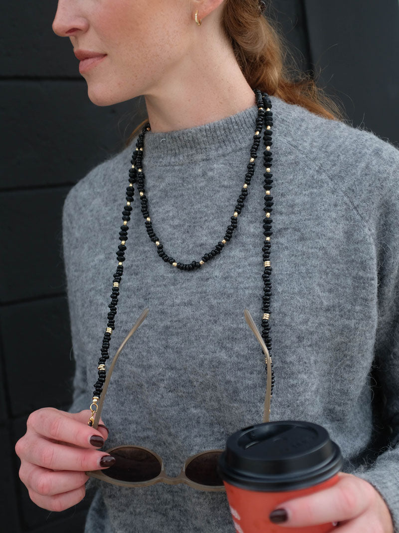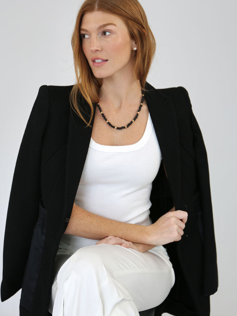 The LBD necklace is sleek, versatile, and undeniably chic—your jewelry equivalent of the little black dress. Hand-strung with petite matte black beads and polished gold accents, it’s finished with a gold-plated clasp for a refined touch. Perfect for layering or wearing solo, this piece adds subtle sophistication to any look, day or night.