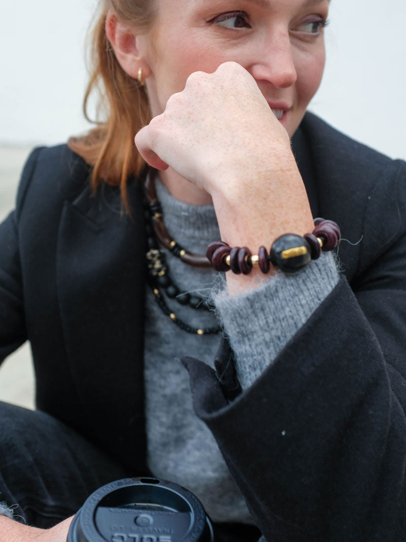 The LIMO capsule is bold, modern, and effortlessly chic. Hand-strung with deep espresso and black beads accented with gold details, each piece is finished with By Lilla’s signature charm and designed to transition seamlessly from statement bracelet to functional hair tie.