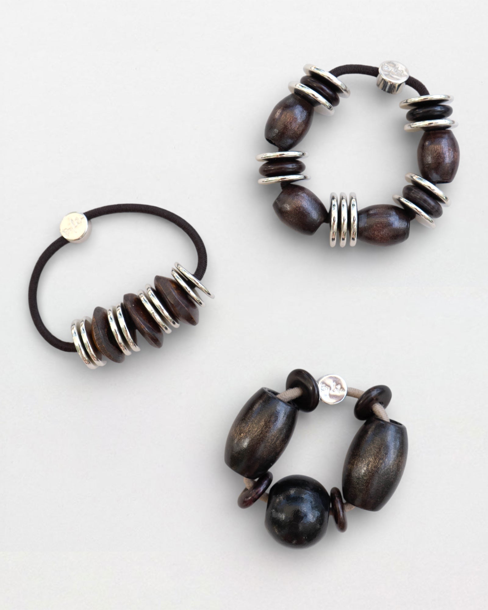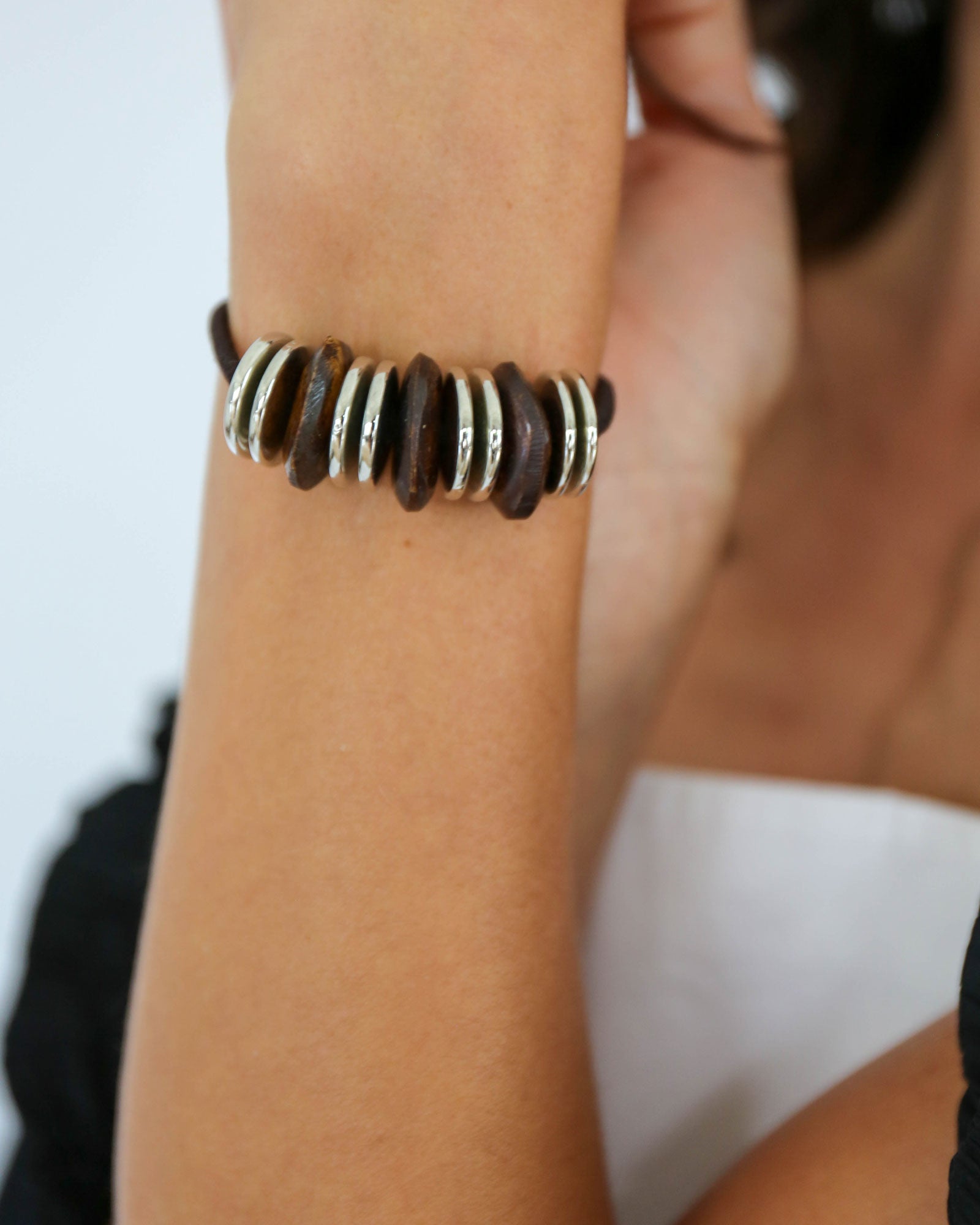 The Luna Capsule is handmade, mixing rich wood discs with polished silver discs for a look that feels both organic and edgy. The contrast of natural texture and sleek metal creates a subtle statement that transitions beautifully from winter layers to lighter spring styling.