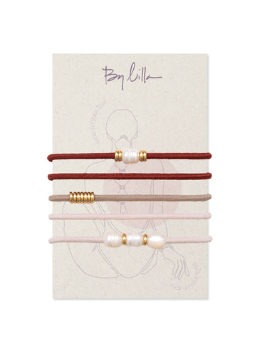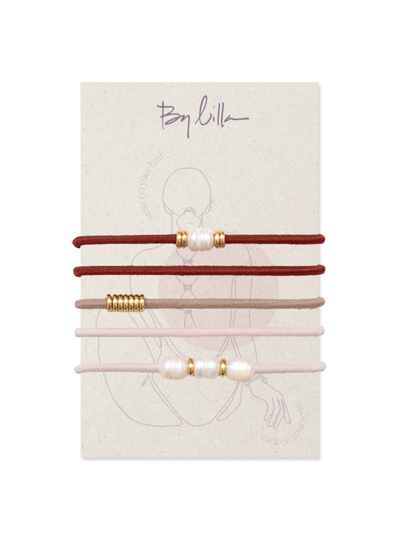 The MINK COAT set made with pearls and gold discs is the epitome of boho chic. Effortlessly transitioning from day to night, each piece is handcrafted to move seamlessly from wrist stack to functional hair tie.