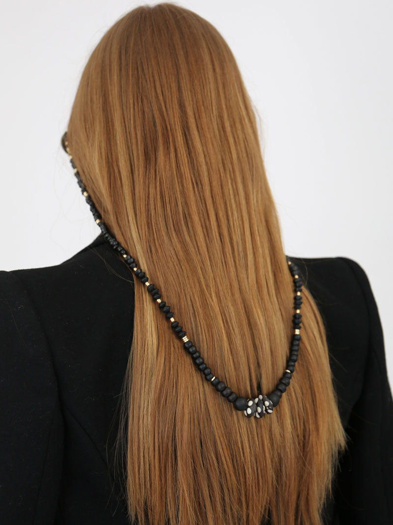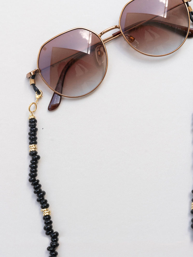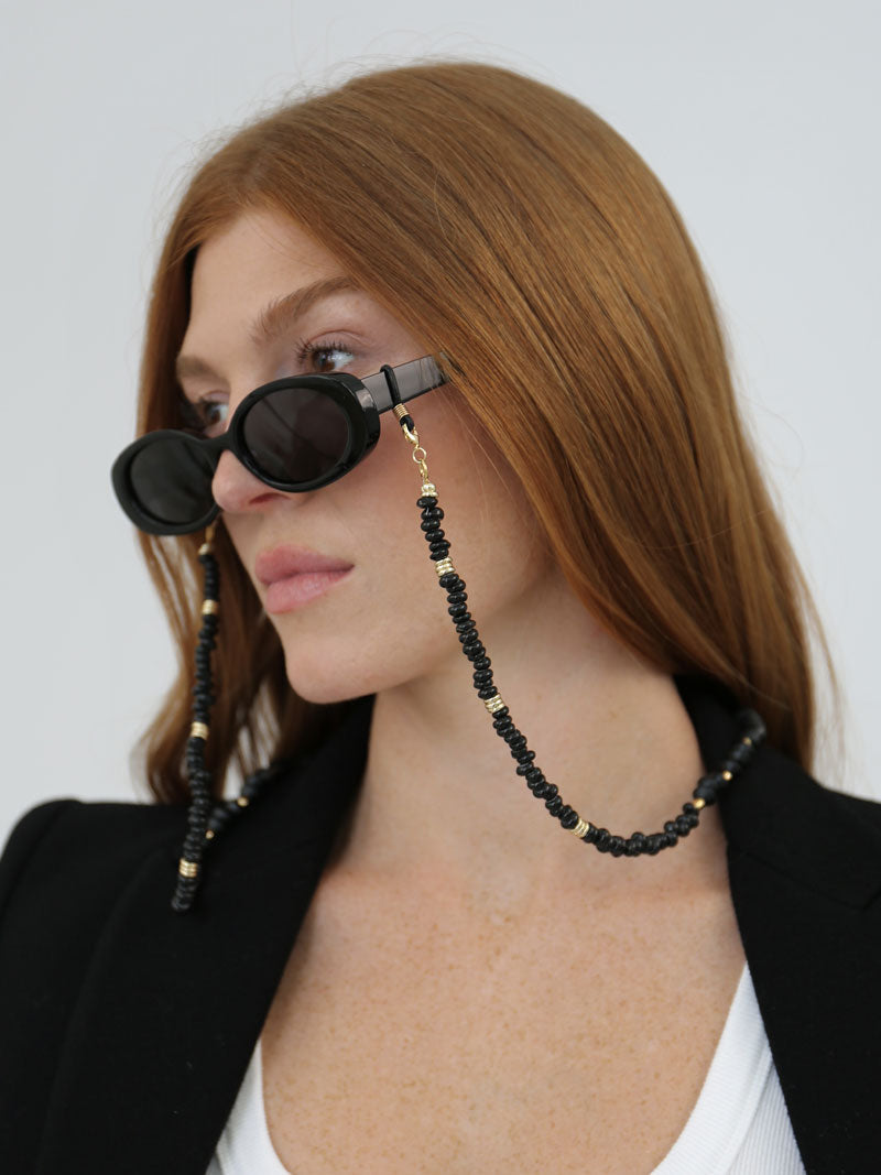 The Noir beaded chain is equal parts function and flair. Hand-strung with a blend of red and small pearls, it’s designed to double as both a necklace and a chic sunglass chain. Finished with gold-plated clasps, this versatile piece adds a touch of effortless style to your everyday essentials.