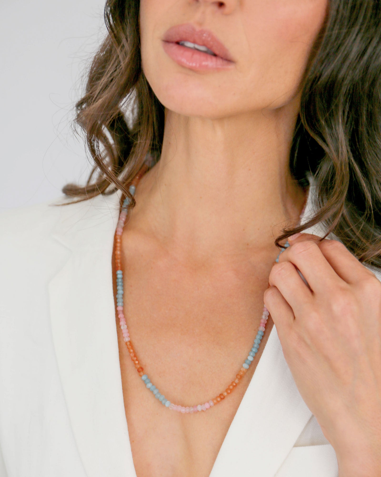 Our Petal necklace is handmade and features a delicate strand of faceted micro beads in soft pastel hues of blush pink, sky blue, and warm apricot. Finished with an 18k gold plated clasp.