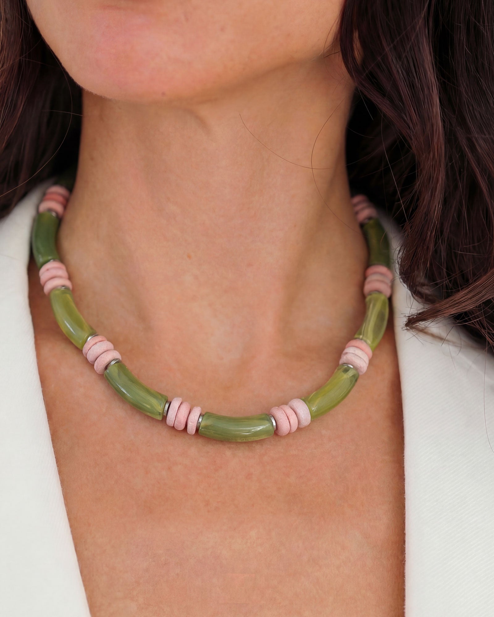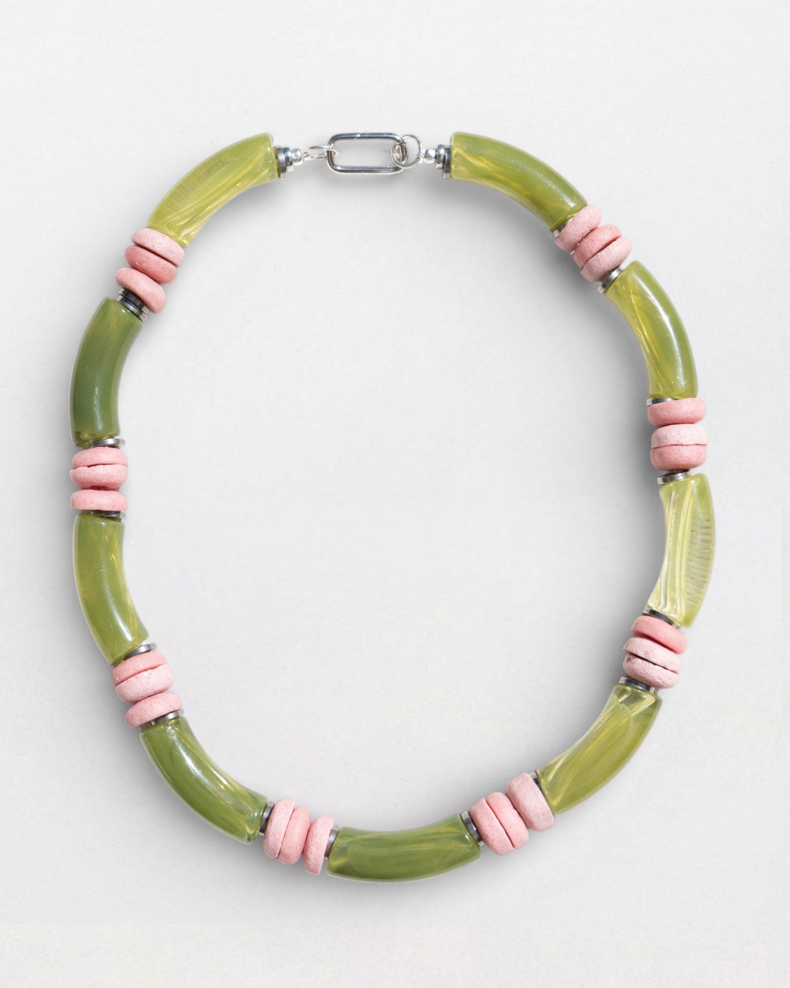 Our Pink Lime necklace is handmade and features bold, curved translucent lime-toned resin beads paired with soft blush ceramic spacers and sleek silver accents. Pink Lime instantly energizes any outfit. Wear it with crisp neutrals for a pop moment or lean into the fun and style it with prints—either way, it’s made to stand out.