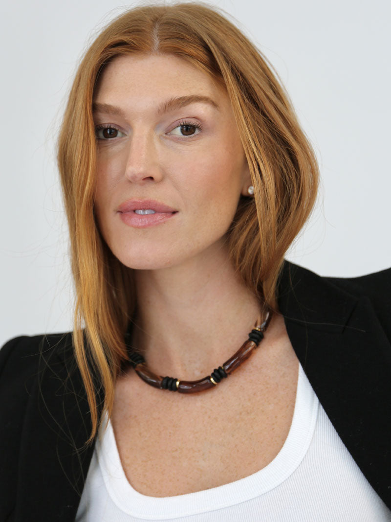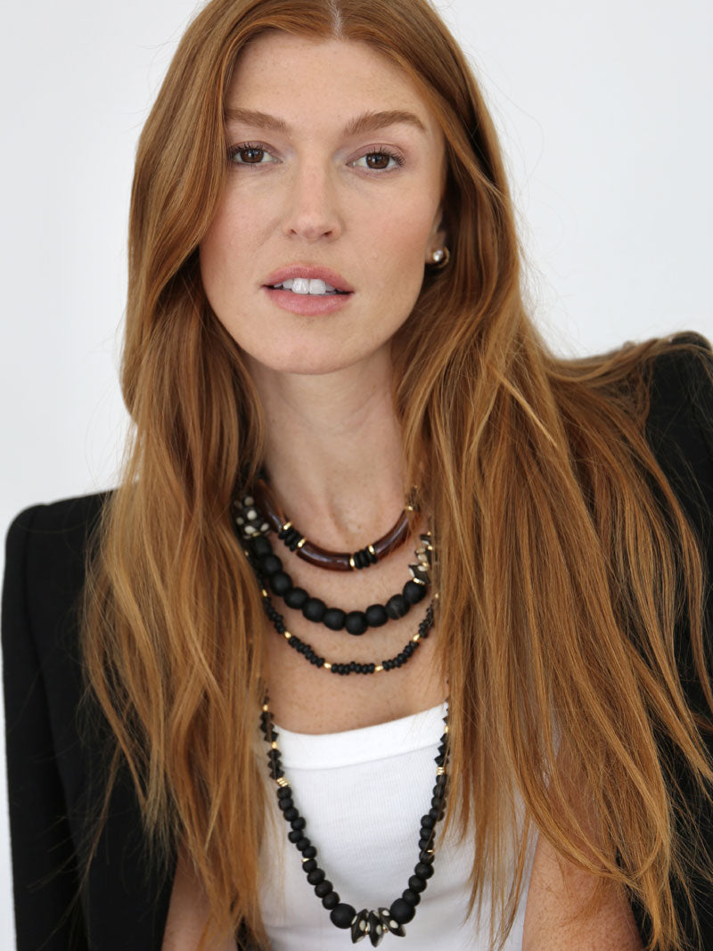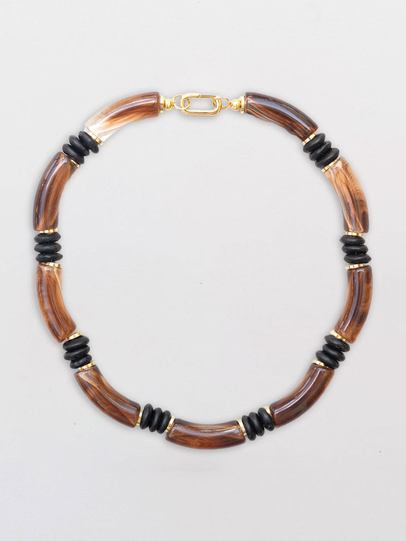 The ROOFTOP necklace channels bold, modern energy with a touch of vintage charm. Hand-strung with curved horn-inspired beads and matte black discs, it’s finished with gold-plated details and a statement clasp. Sophisticated yet grounded, this piece brings an earthy edge to any look—perfect for stacking or wearing solo.