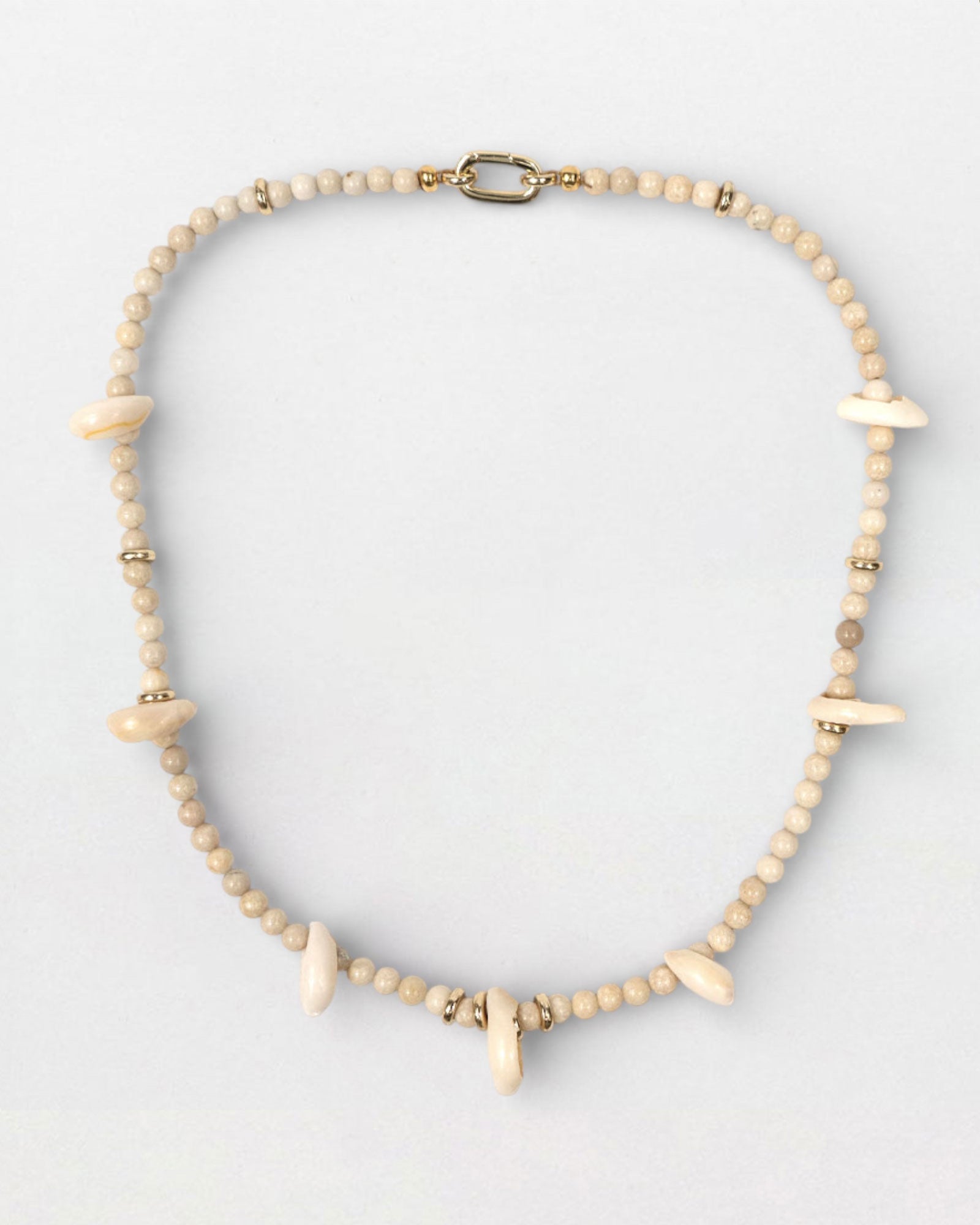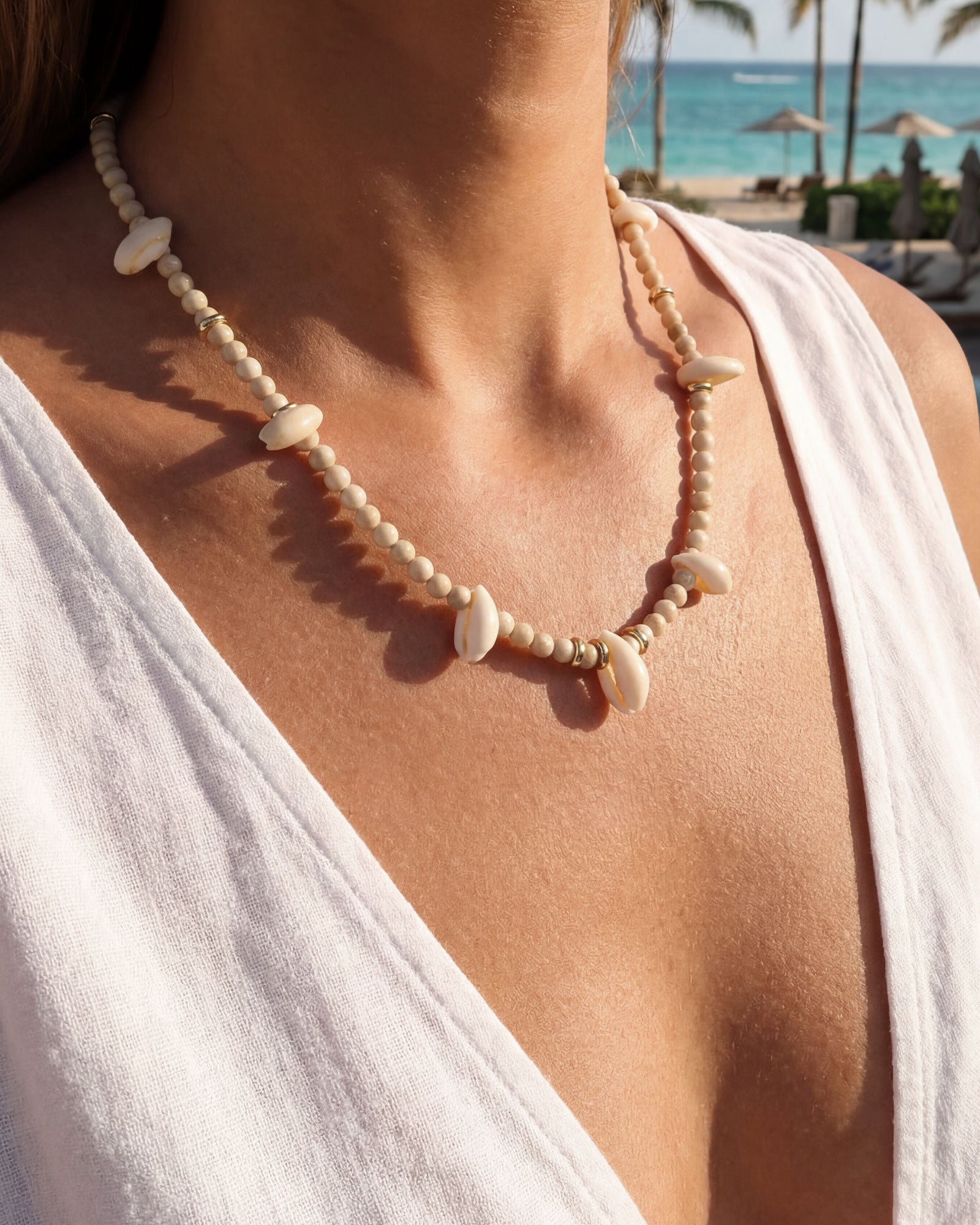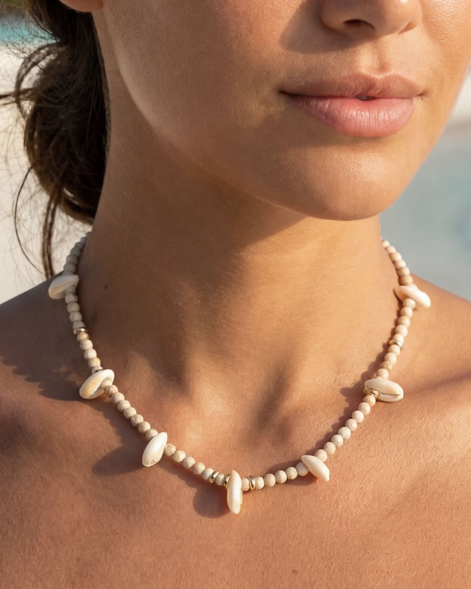 Meet SEASHELL – your everyday neutral with a touch of beachside elegance. This necklace features smooth cream-toned beads accented with organic shell-inspired pieces and subtle gold spacers, creating a look that’s both natural and refined.