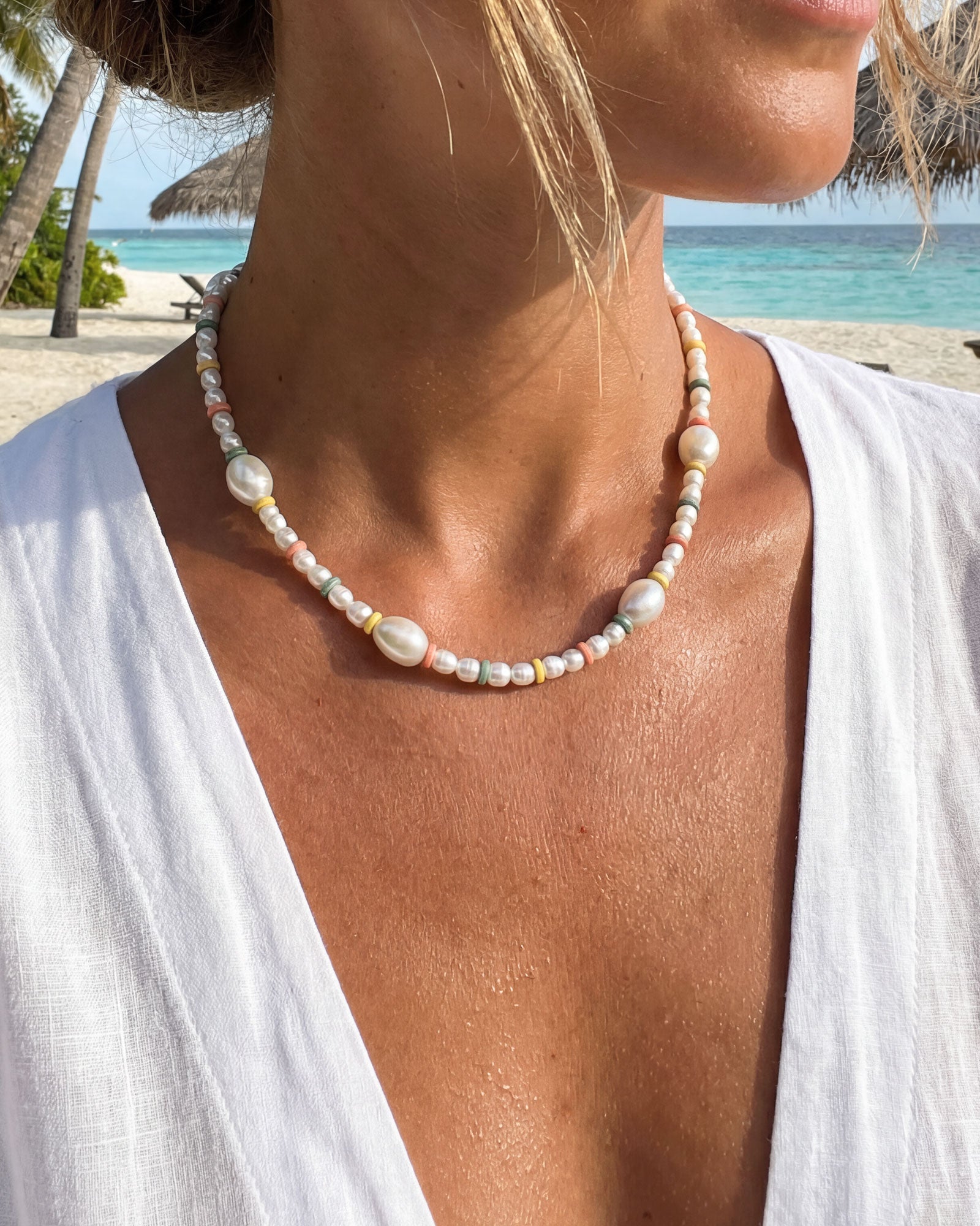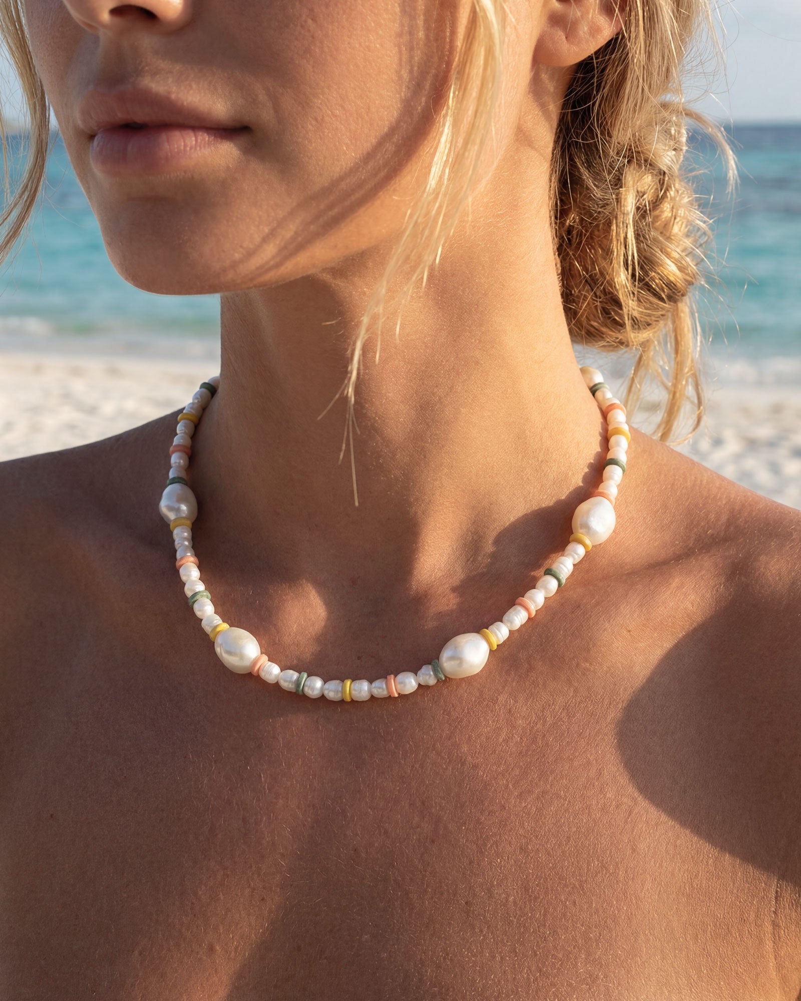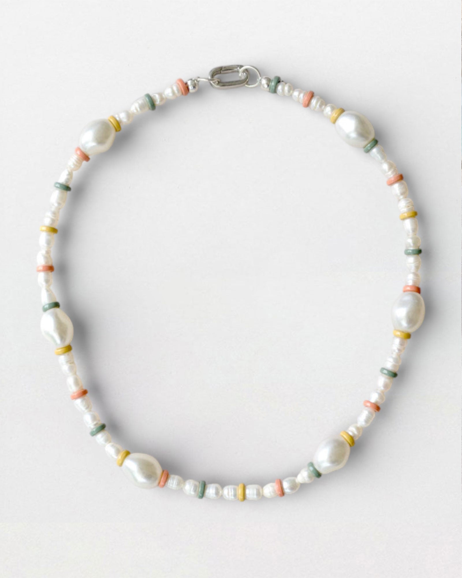 Say hello to SURF – the necklace that brings carefree coastal vibes wherever you go. Featuring luminous pearls paired with playful pastel disc beads in coral, sage, and sunshine yellow, this piece is designed to add a touch of whimsy and elegance to any look. Wear it solo for a subtle statement or layer it to create your own beach-inspired stack.